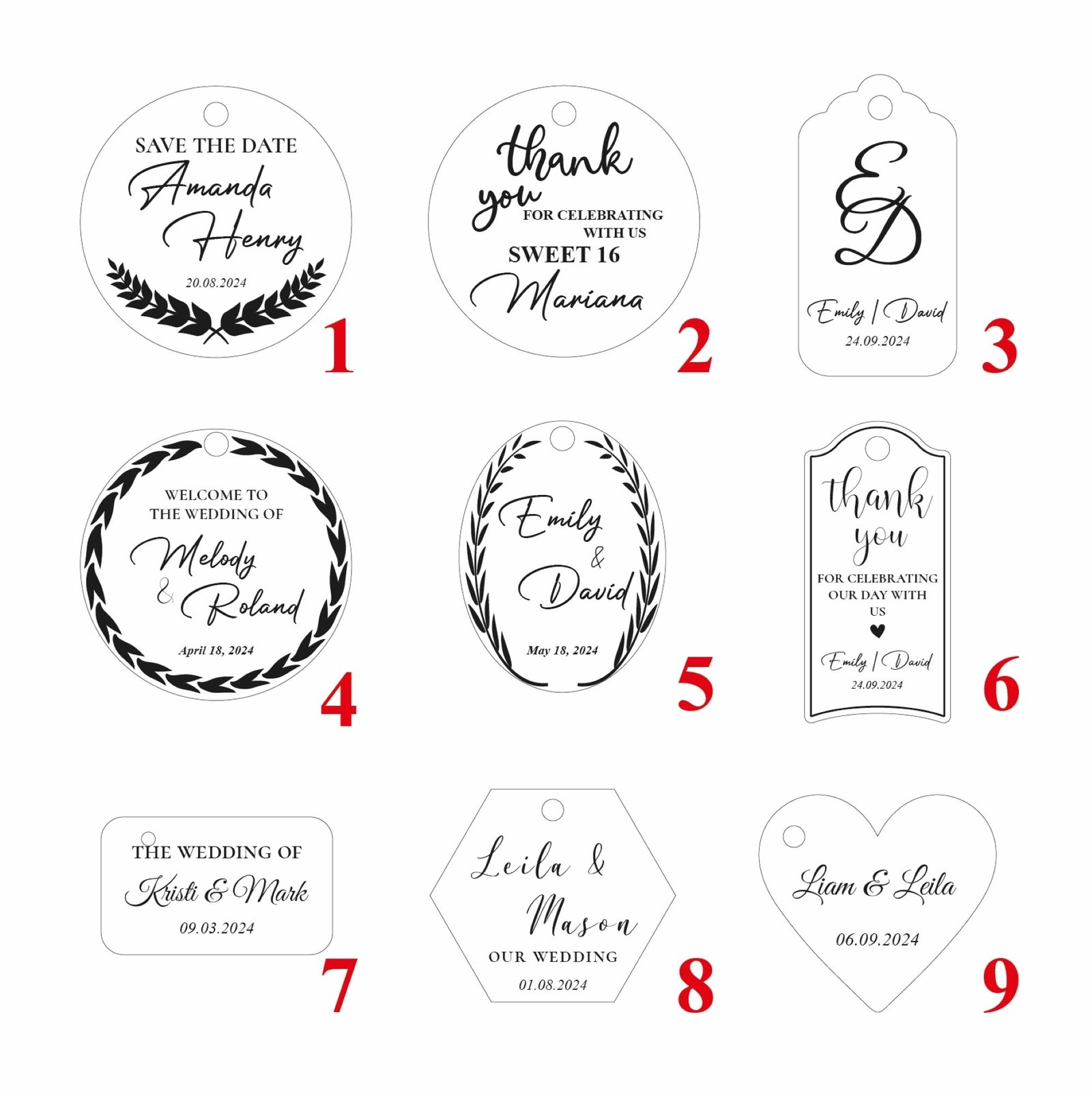 • 📐 Various Size Options Choose the size that best suits your event aesthetic—from dainty mini-tags to statement-sized decor pieces.