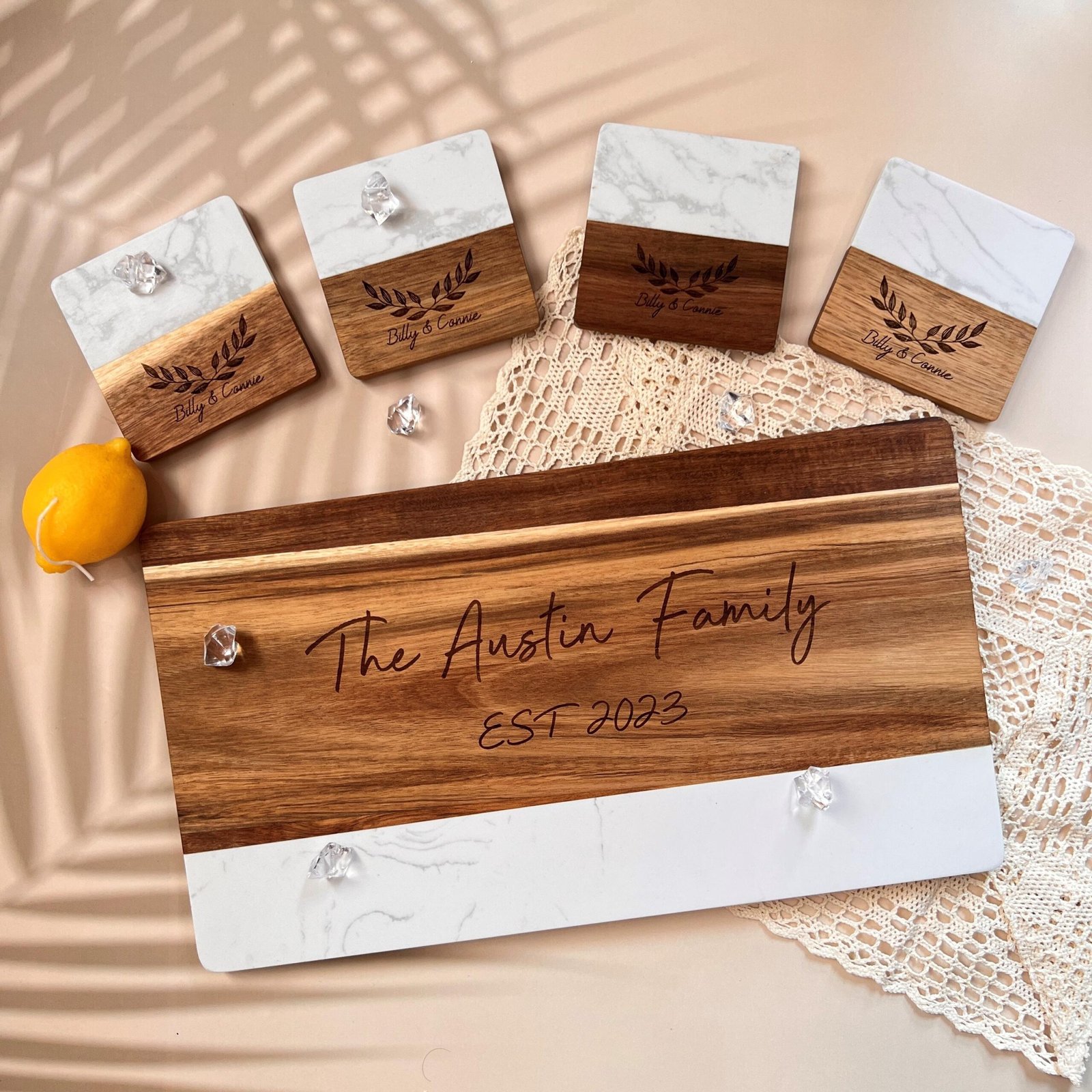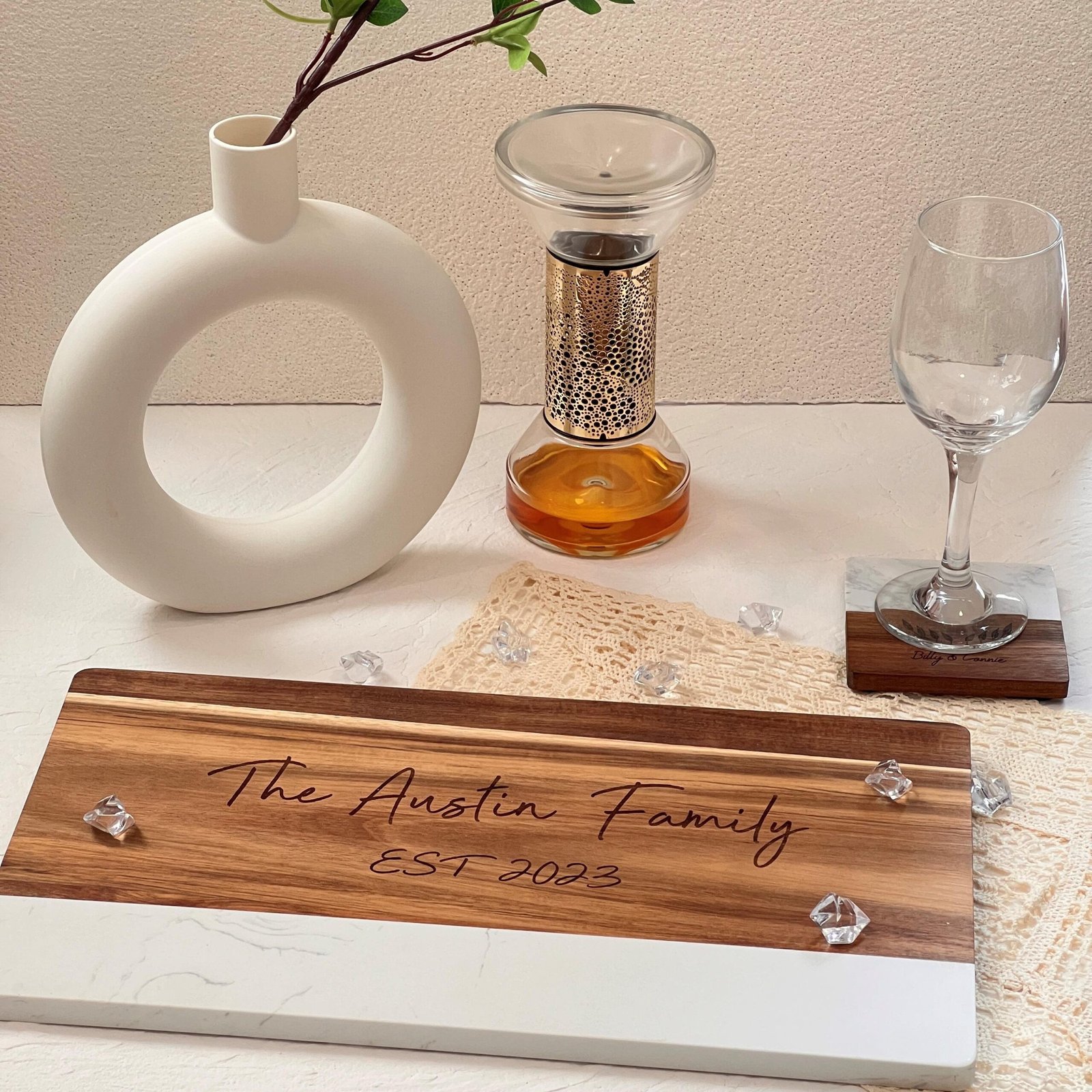 - 🥂 Coordinated Coaster Set Option Pair it with matching custom marble-wood coasters for a complete hosting ensemble.